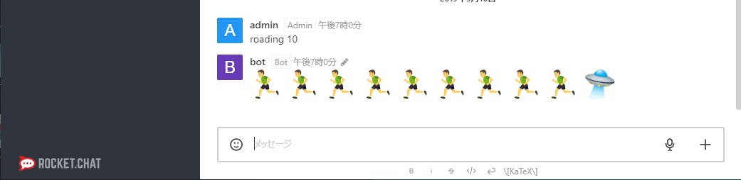 ・Hubot v3.3.2 ・RocketChat v1.3.1 ・node.js v10.16.2 ・request v2.88.0 ・request-promise v4.2.4 ・node-cron v2.0.3 ・uuid v3.3.2